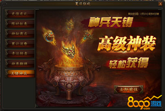 活动期间,天铸神兵限时出现在比奇城,投入低级神装,花费少量元宝即有机会获得更高级神装,从此快人一步,集齐高阶神装不是梦!