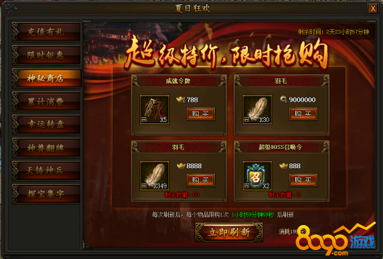 活动期间,每两小时神秘商店会自动刷新一批道具,也可花费元宝立即刷新,大量道具限时等你抢购。