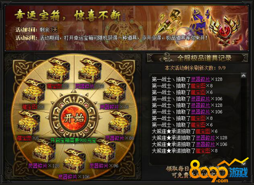 【活动内容】活动期间,打开幸运宝箱可随机获得一种道具,多开多得,极品道具等你来开!(活动期间只能刷新9次)