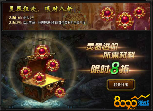 【活动内容】活动期间,升级神炉中的灵器所需材料限时八折优惠!