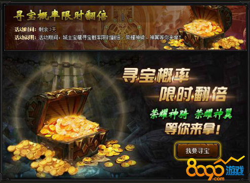【活动内容】活动期间,城主宝藏寻宝概率限时翻倍,荣耀神骑、荣耀神翼等你来拿!