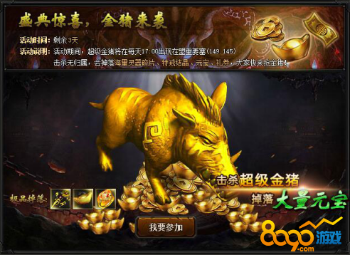 【活动内容】活动期间,超级金猪将在每天17:00出现在盟重要塞(149.145),击杀超级金猪将会掉落海量材料、元宝、礼券、特戒结晶,大家快来抢金猪!(注:金猪掉落无归属)