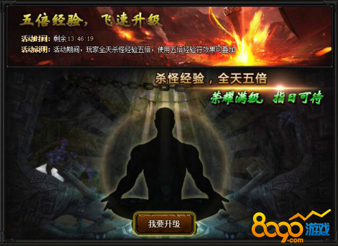 【活动内容】活动期间,全服双倍经验活动全天开启,所有玩家击杀怪物获得的经验翻倍,海量经验轻松获得!(使用多倍经验符效果可叠加)
