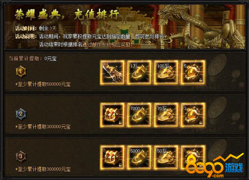 【活动内容】活动期间,每天只要充值达到2000元宝,即可领取荣耀盛典超值礼包!