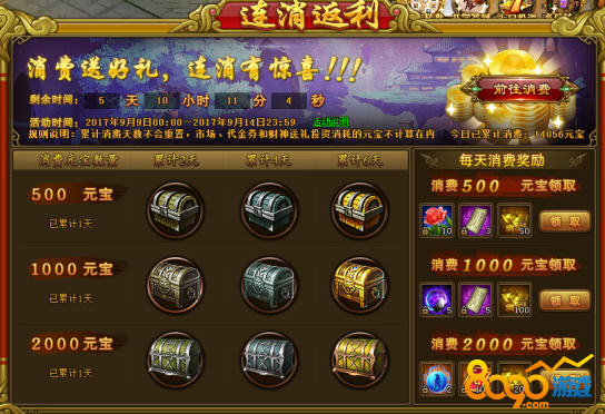 活动规则:活动期间内,玩家累计消费达到一定金额在活动结束后可领取最高档奖励;