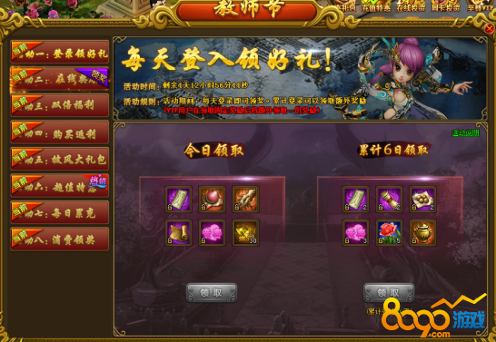 Vip用户累计6天:副本卷轴*3、1千亲密度*5、2千驯兽卷轴*3、2倍圣心丹*1、单恋玫瑰*20、2000万经验宝葫*1。