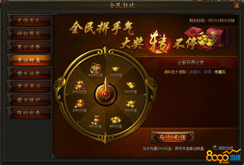 活动期间,充值并消费一定元宝即可使用幸运转盘,获得大量不绑定元宝返还。