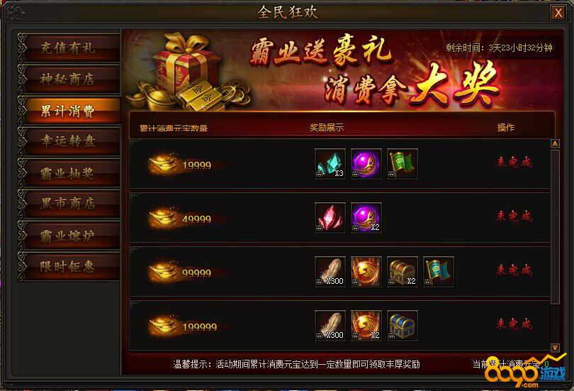 活动期间,累计消费一定数量元宝,即可领取对应档奖励,每个角色只能领取一次。