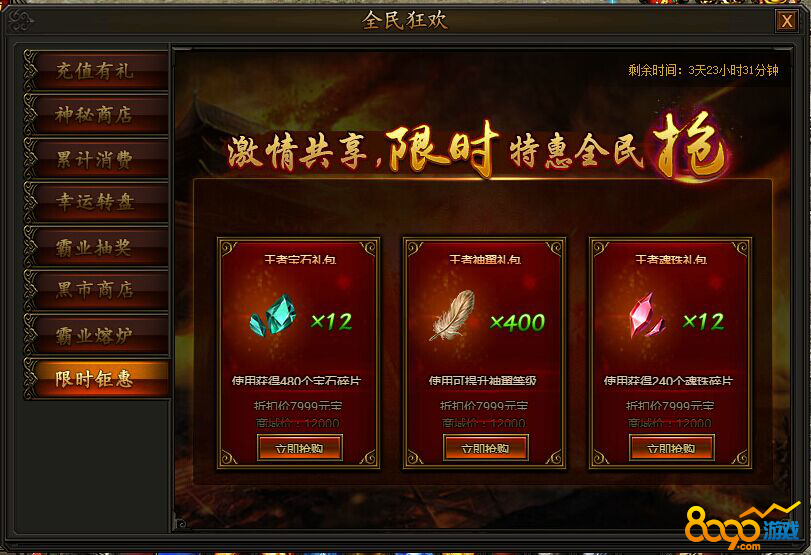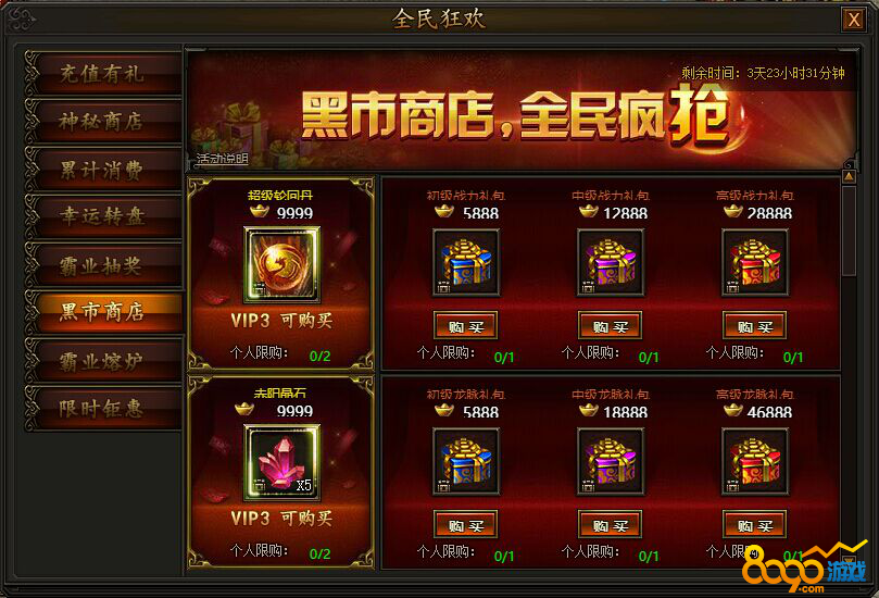 活动期间,每天会随机刷新一批特价道具,花费少量元宝即可购买,每个道具均有每天最大个人购买次数限制,部分道具有购买vip等级限制,买到就是赚到,机会不容错过!