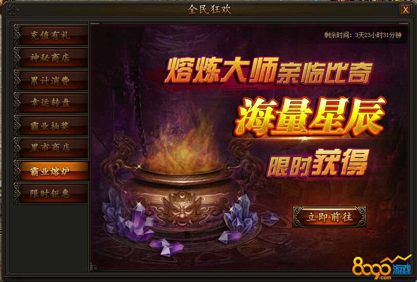 活动期间,熔炼大师出现在比奇城,熔炼5转及以上转升装备,百分百获得星辰晶石,机会难得不容错过,开服15天及以上的区服所有玩家才可参与。