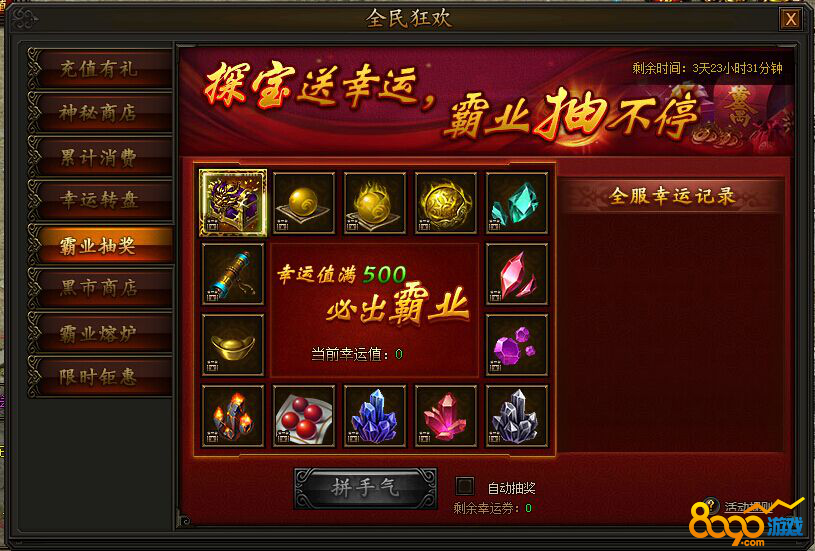 活动期间每探宝十次即送一张幸运券,可用于参与霸业抽奖,有机会获得海量材料和霸业装备!每次抽奖即可获得一点幸运值,幸运值达到500点抽奖必出霸业装备箱!