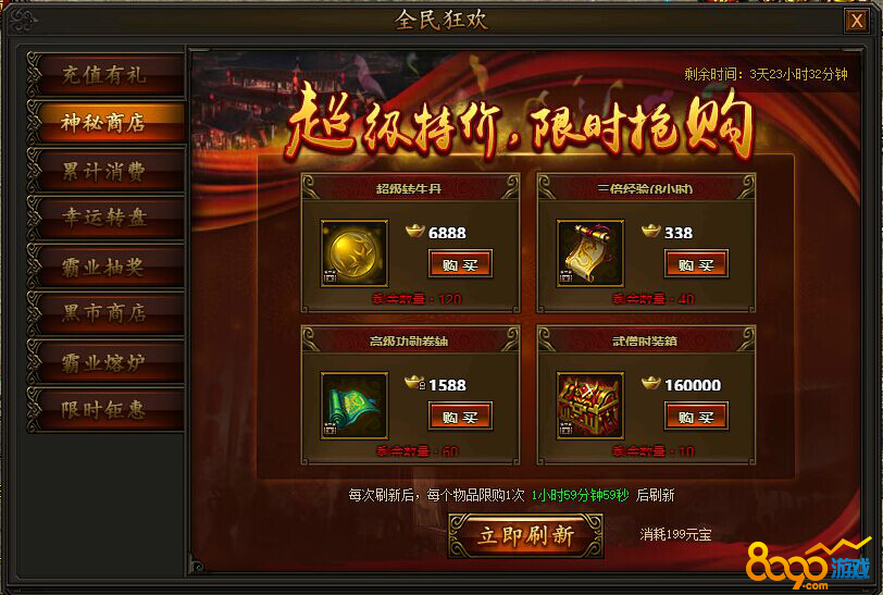 活动期间,每两小时神秘商店会自动刷新一批道具,也可花费元宝立即刷新,大量道具限时等你抢购,还有机会刷出极品时装,不容错过。