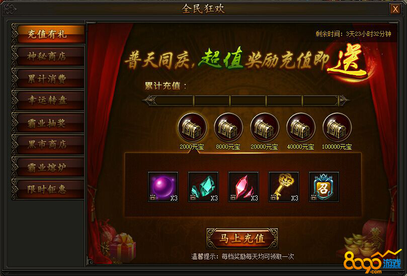 活动期间,充值元宝即可领取五档丰厚奖励,每天均可领取一次,不容错过!