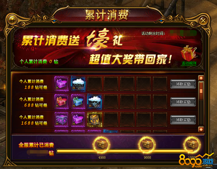 2、活动期间全服总消费每达到一定额度后,所有人均可获得一份免费大礼包。