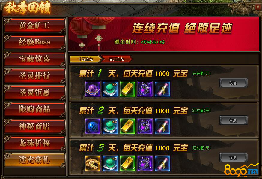 1、活动期间,每天充值10元,100元可领取相应奖励。