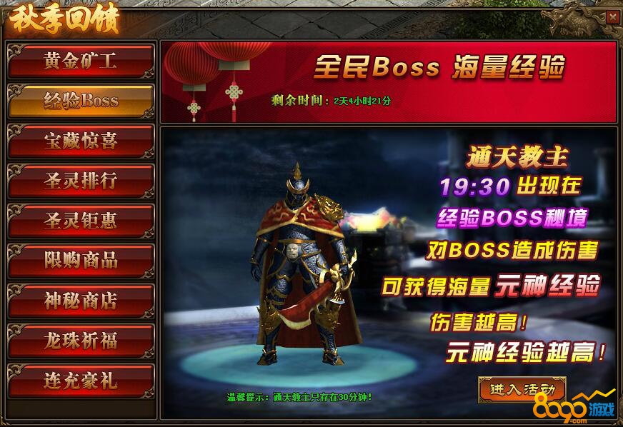 2、活动中,玩家对BOSS造成的伤害,将在活动结束后转换成元神经验并发放;