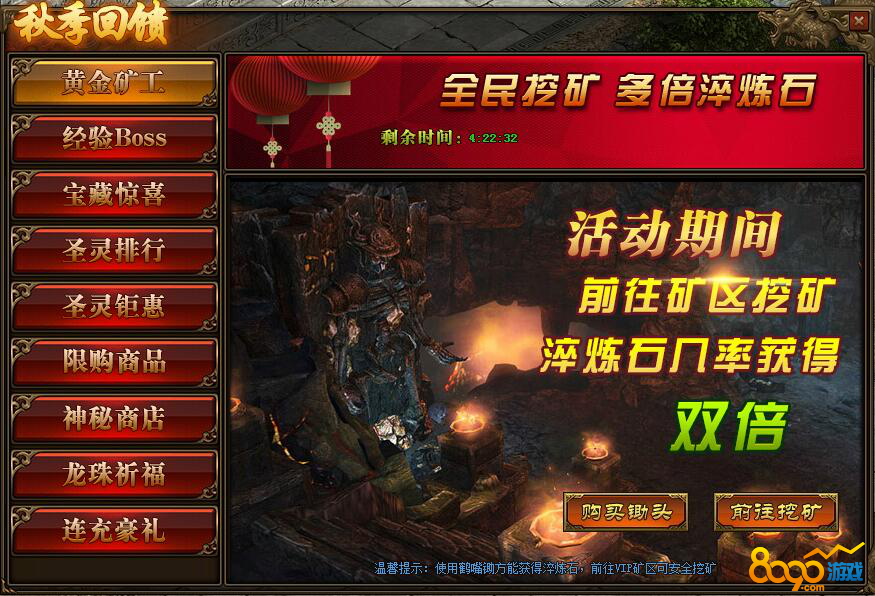 1、活动期间,玩家使用“鹤嘴锄”进行挖矿,获得“淬炼石”的概率翻倍;