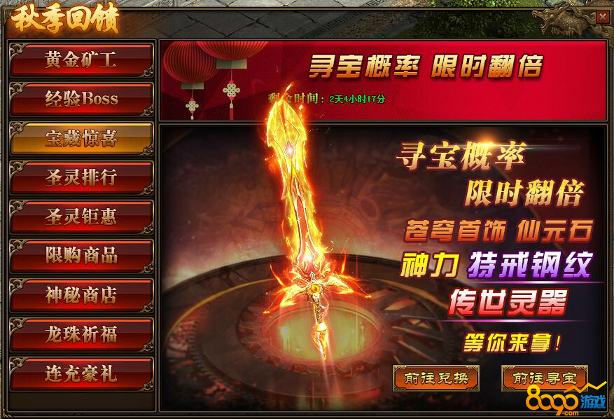 1、活动期间,玩家寻宝概率翻倍,极高几率获得仙元石,苍穹套装,特戒钢纹,以及<超强攻击>传世灵器-传世灵器·战;传世灵器·法;传世灵器·道;
