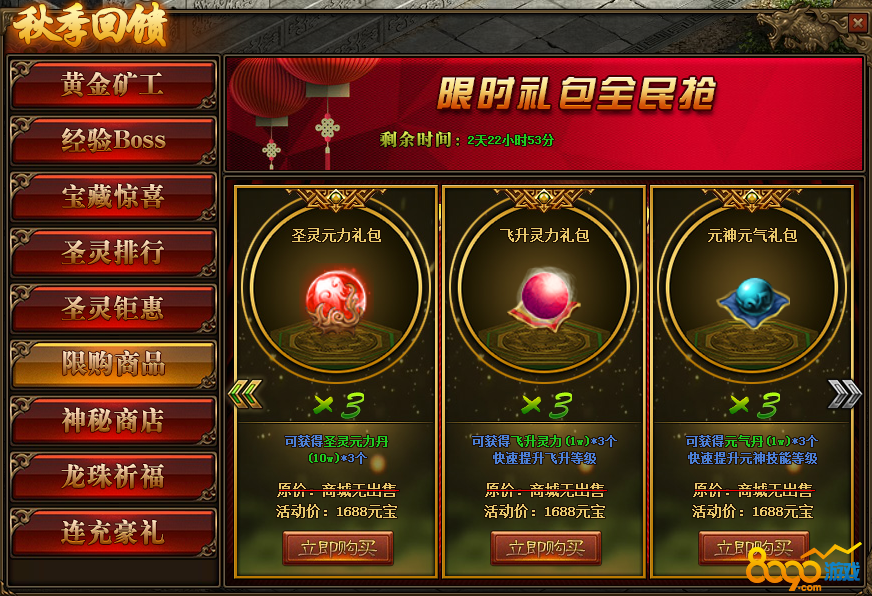 1、活动期间,玩家可在活动面板购买限购商品;(可翻页)