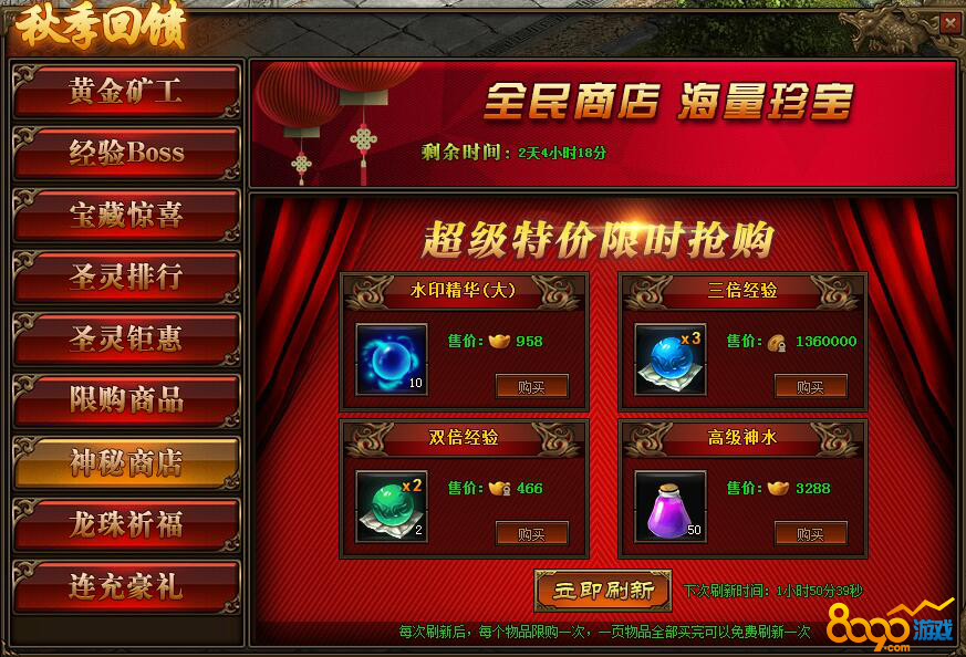 2、神秘商店每2小时自动刷新一次,也可用花费元宝立即刷新;
