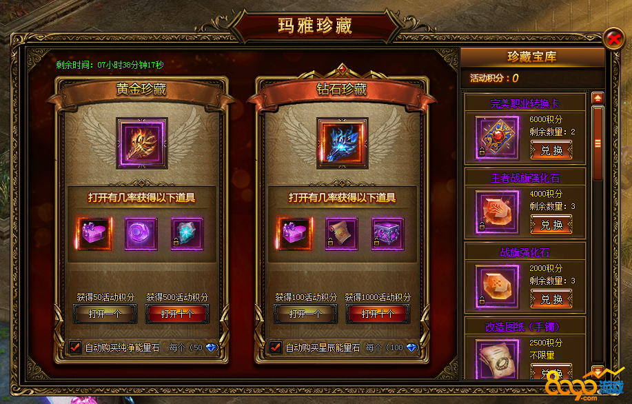 珍藏宝库可兑换奖励:完美职业转换卡、王者战旗强化石、战旗强化石、重生密钥、改造图纸(手镯)、改造图纸(吊坠)等。