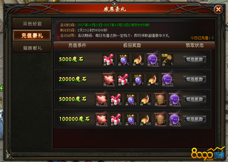 活动说明:活动期间,每天充值达到指定魔石可领取对应奖励!