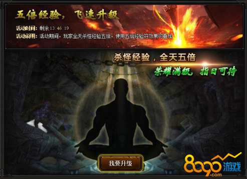 【活动内容】活动期间,全服双倍经验活动全天开启,所有玩家击杀怪物获得的经验翻倍,海量经验轻松获得!(使用多倍经验符效果可叠加)