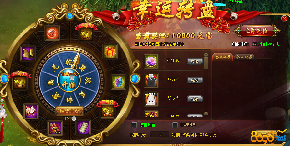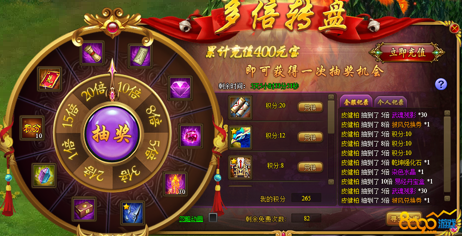 活动规则:活动期间内,每充值400元宝即可获得一次抽奖机会,根据抽奖结果可以获得相应倍数的道具