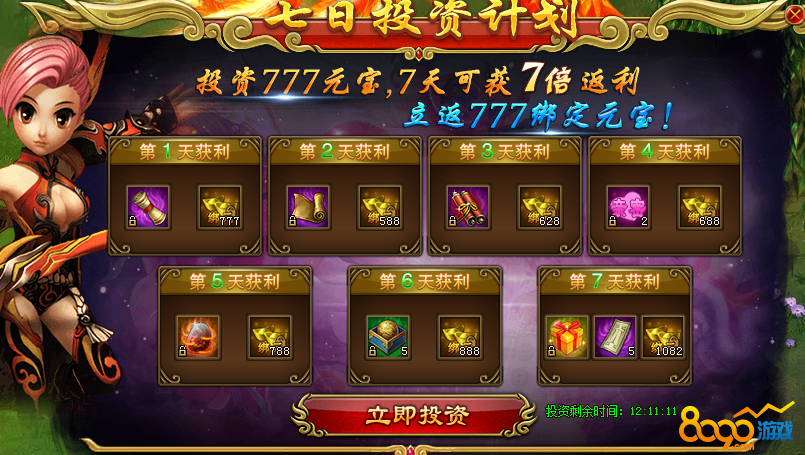 活动规则: 投资777元宝,7天可获得7倍的返利,每天可以领取相应的道具。
