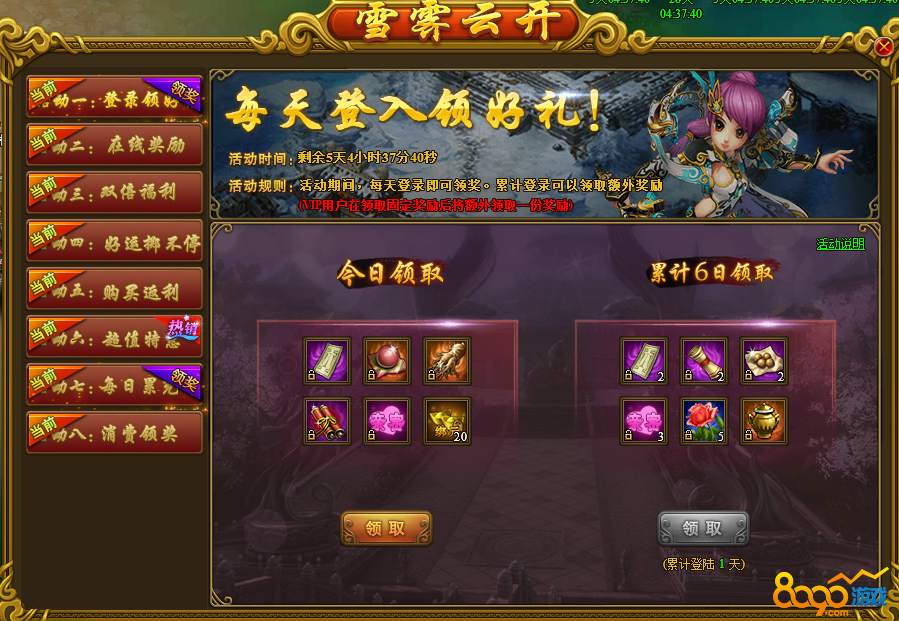 5. 第五天登录即可领取:50绑元、副本卷轴*3、至尊九转丹*1、至尊千年雪参*1、4千历练值*1、1000亲密度*1;