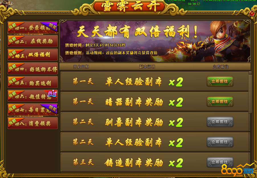 4. 第四天登录即可领取:40绑元、副本卷轴*2、至尊九转丹*1、至尊千年雪参*1、2W武勋卷轴*1、1000亲密度*1;