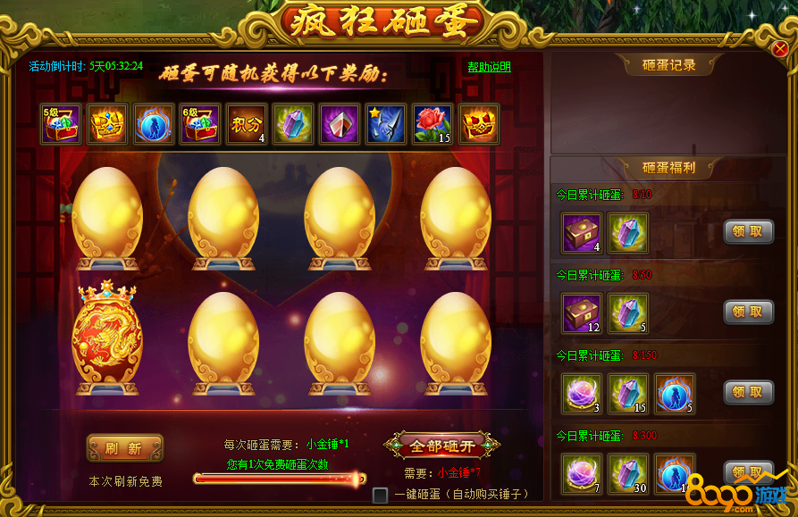 活动规则:活动期间内,玩家消耗小金锤即可进行砸蛋,砸蛋一次需要消耗小金锤*1;直接砸开8个金蛋需要消耗小金锤*8,购买一个小金锤需要消耗20元宝。当前金蛋全部被砸开后,自动刷新金蛋,砸开金蛋必定获得道具奖励,砸蛋次数符合要求,即可立即领取砸蛋福利,多砸多送。刷新金蛋有几率出现高级金蛋,高级金蛋砸开后奖励更加丰厚。