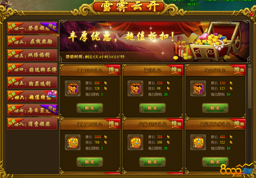 7. 每日累计充值20000元宝可获得:纵马江湖礼包*1、中级战力礼包*1、(提真晶石,宝甲精魂,坐骑精魂)三选一*5、神佑卷轴*10、玄火珍选礼盒*5;