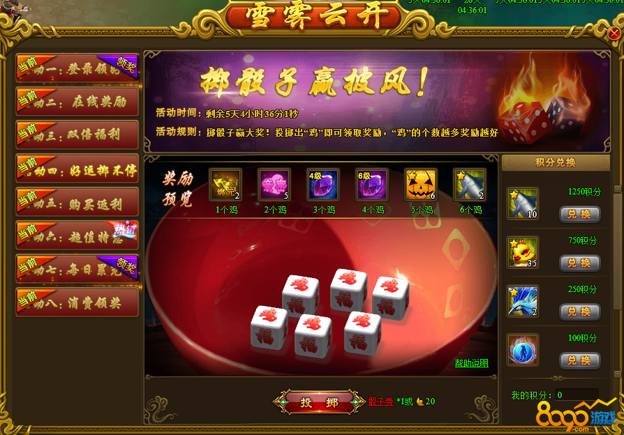 活动规则:掷骰子赢大奖,投掷出“鸡”即可领取奖励,“鸡”的个数越多奖励越好。
