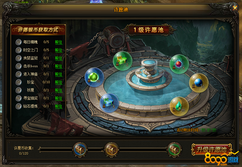 2、收集许愿币升级许愿池可以获得丰厚的奖励,许愿币收集满后可升级许愿池,许愿池升级后,许愿币将重新计算,不作累计;