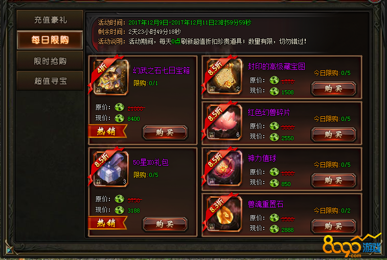 活动说明:活动期间,每天0点刷新超值折扣珍贵道具! 数量优先,切勿错过