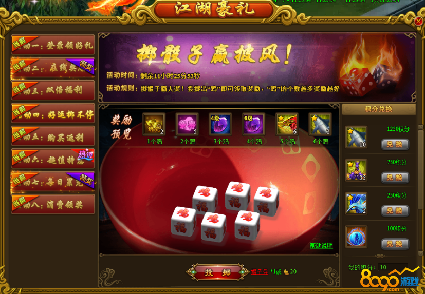 活动规则:掷骰子赢大奖,投掷出“鸡”即可领取奖励,“鸡”的个数越多奖励越好。