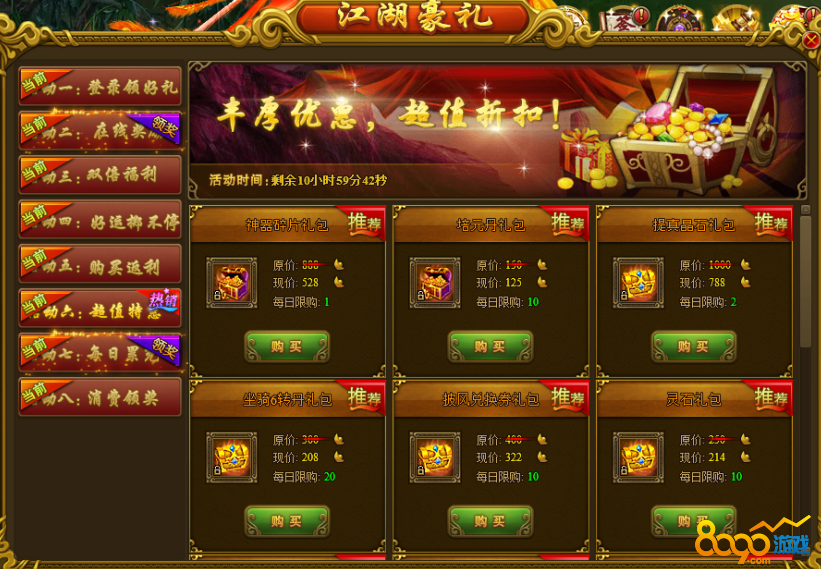 6. 每日累计充值10000元宝可获得:行侠江湖礼包*1、初级战力礼包*1、(提真晶石,宝甲精魂,坐骑精魂)三选一*2、神佑卷轴*4、玄火珍选礼盒*2;