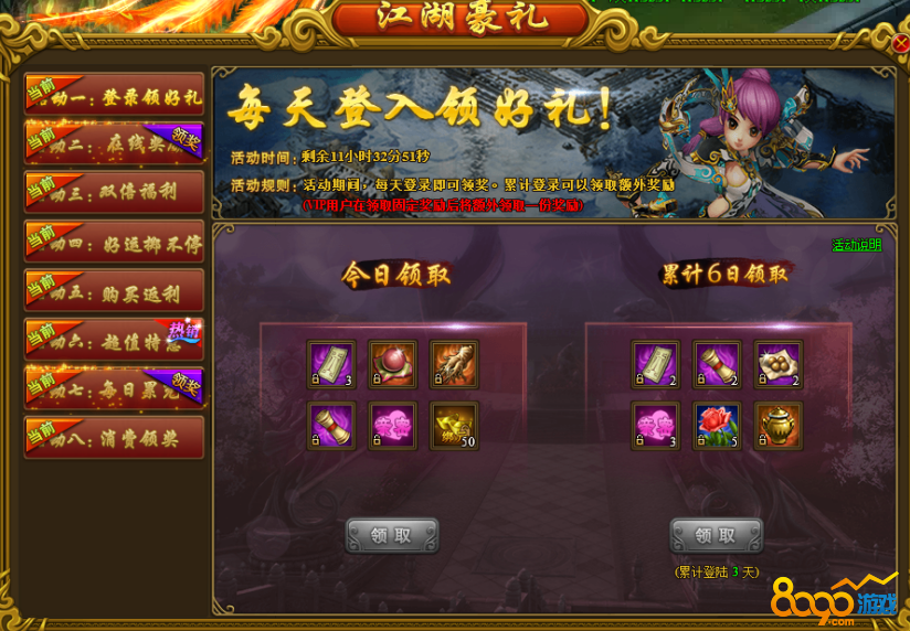 6. 第六天登录即可领取:50绑元、副本卷轴*3、至尊九转丹*1、至尊千年雪参*1、2千驯兽卷轴*1、1000亲密度*1;
