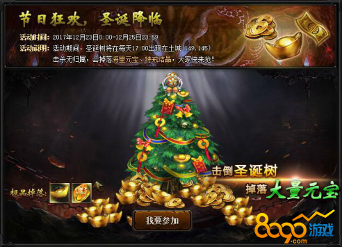 【活动内容】活动期间,圣诞树将在每天17:00出现在土城(149.145),击倒圣诞树将会掉落海量元宝、礼券、特戒结晶,大家快来抢圣诞礼物!(注:圣诞树掉落无归属)