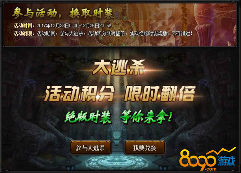 【活动内容】活动期间,参与大逃杀,活动积分限时翻倍,换取绝版时装奖励,不容错过!
