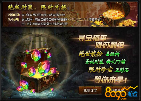 【活动内容】活动期间,城主宝藏寻宝概率限时翻倍,绝世珍宝五彩石等你来拿!