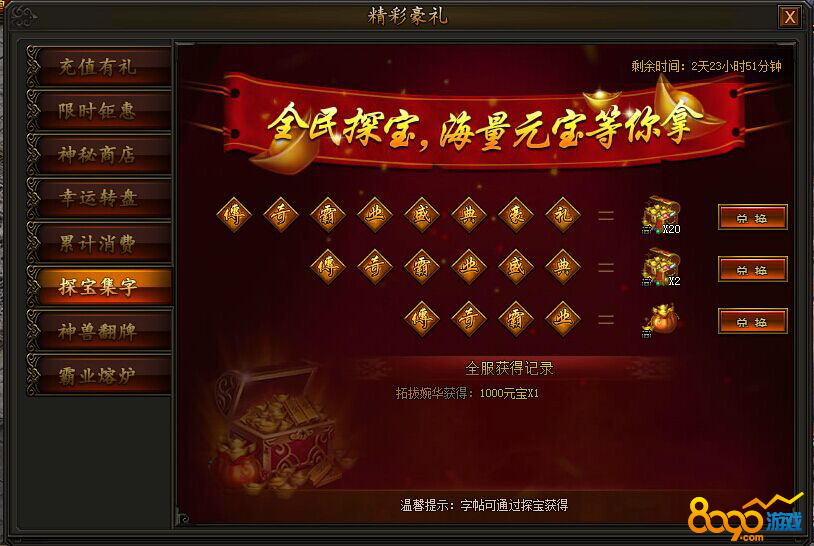 活动期间,探宝可能获得“传奇霸业盛典豪礼”字帖,集齐字帖可兑换海量不绑定元宝奖励!