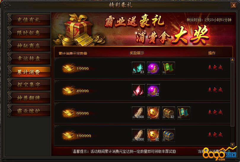 活动期间,累计消费一定数量元宝,即可领取对应档奖励,每个角色只能领取一次。