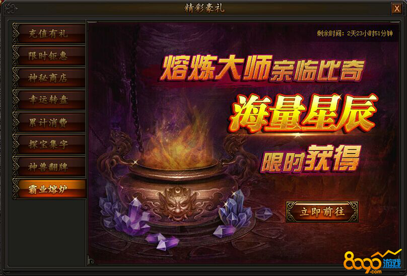 活动期间,熔炼大师出现在比奇城,熔炼5转及以上转升装备,百分百获得星辰晶石,机会难得不容错过,开服15天及以上的区服所有玩家才可参与。