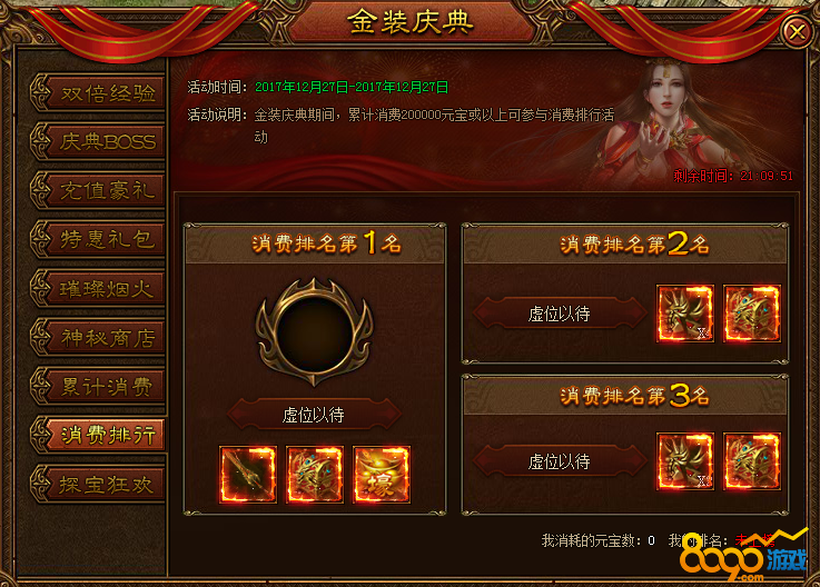 活动期间,累计消费200000元宝即可参与排行,排行奖励活动结束时通过邮件发放。星王神剑、星王攻击首饰碎片、至尊抵抗符文宝箱、绝版称号等你来拿!