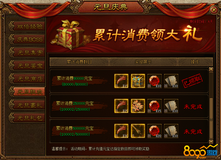 活动内容:活动期间达到累计消费即可领取奖励,可领取奖励有:龙心、龙鳞、龙牙、魔血精华、大师技能宝箱、高级气海修为丹。