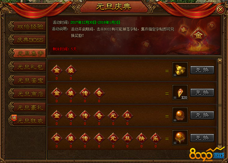 活动内容:活动期间,击杀BOSS可能掉落字帖,集齐指定字帖即可兑换奖励!