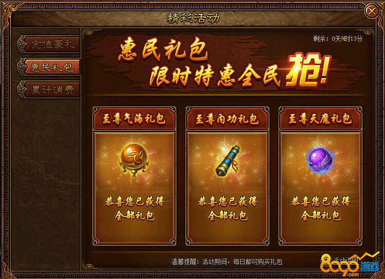 活动内容:活动期间特惠礼包每日共会出现3种不同的礼包,每种礼包可购买3个档次,且礼包内容根据不同的开服天数分为 开服前7天、开服第8天之后,,购买可获得大量优惠