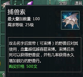 在周三13:00,周六21:00,95k盛世三国开启追猎者的活动中,就会用到捕兽索。这个时候不要犹豫,赶紧去商店里买捕兽索吧,每个捕兽索500文。拿着它们去捕兽吧。